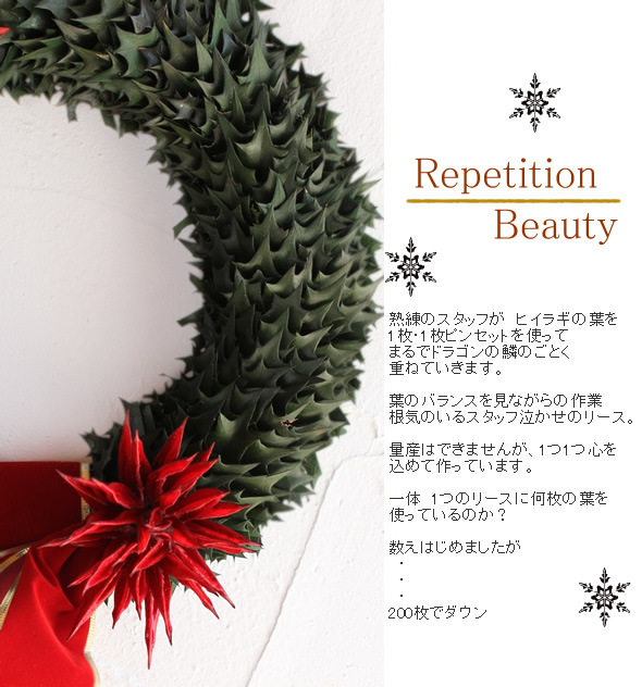 ヒイラギの葉を1枚1枚重ねて作った 手作りリース。 シンプルだけど抜群の存在感。
